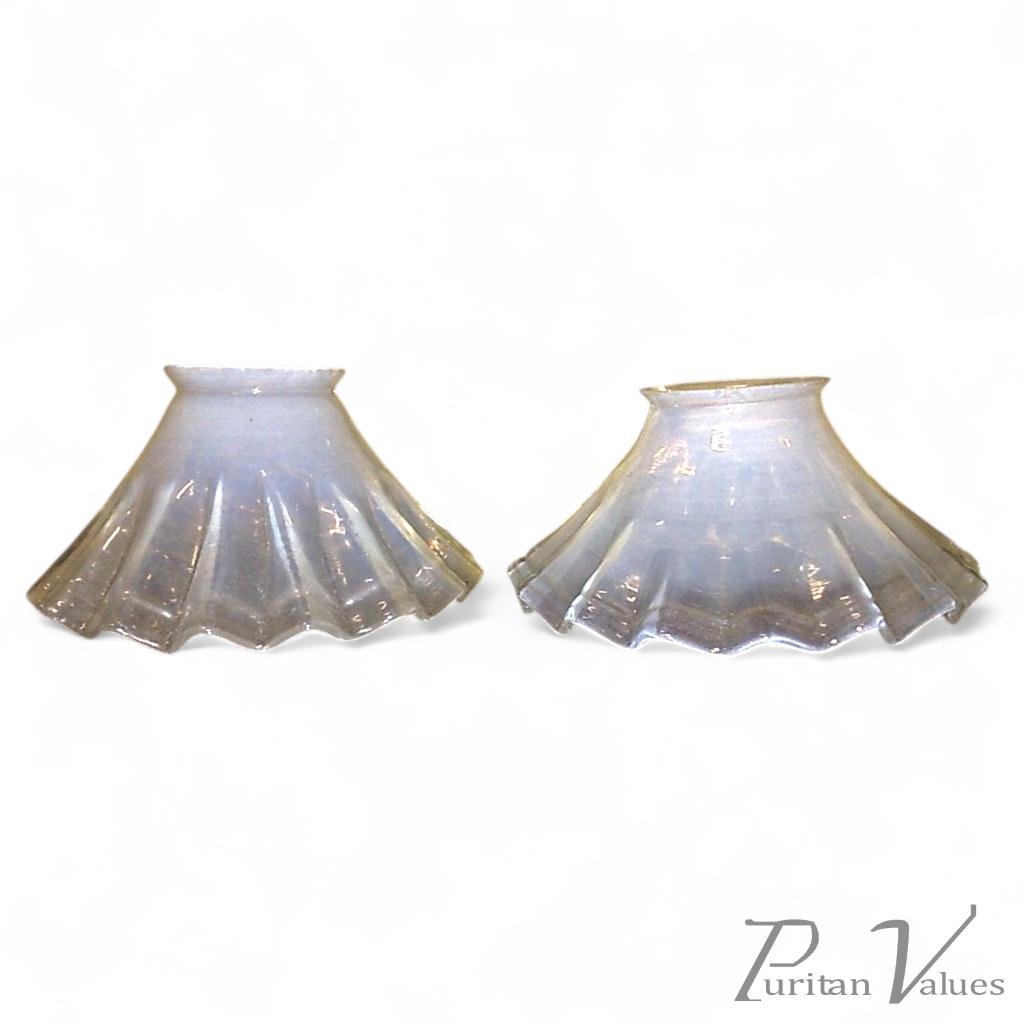 This pair of glass shades, formed in translucent milky glass during the French style period c.1910, display the delicate ribbing and scalloped edges associated with early twentieth-century domestic lighting. Each is of circular flared form with a narrow neck, expanding towards an undulating rim that diffuses light evenly when fitted. The material and soft opacity are consistent with French production of the period.