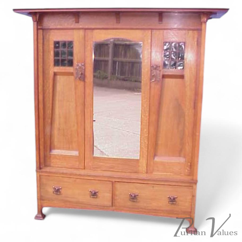 An Arts and Crafts oak treble wardrobe in the Glasgow Style made by Harris Lebus and retailed by Liberty and Co, with flaring cornice. A full length mirror flanked by two doors with wonderful green glass squares to the top and A frame central panels and two drawers below on square platform feet and the best quality copper handles. Height ", Width of cornice ", Depth of Cornice". Circa 1900.