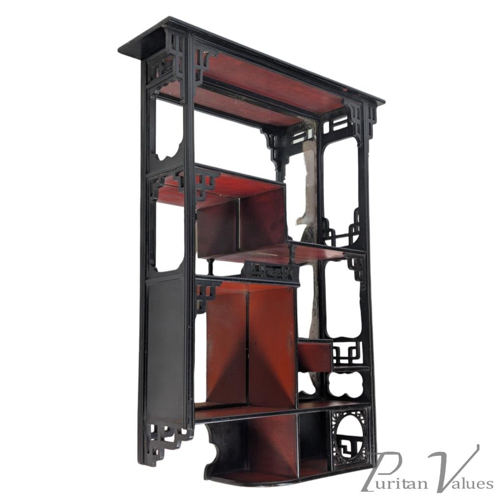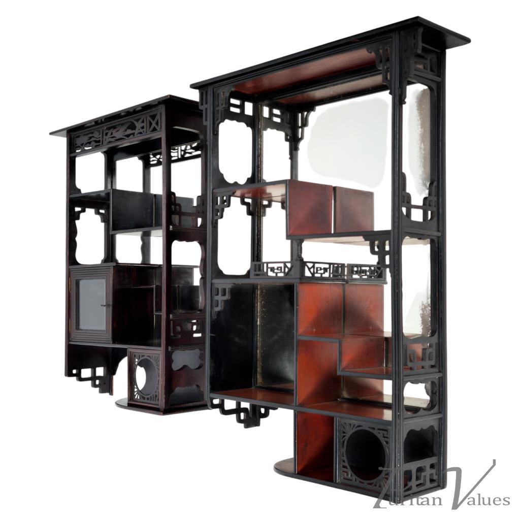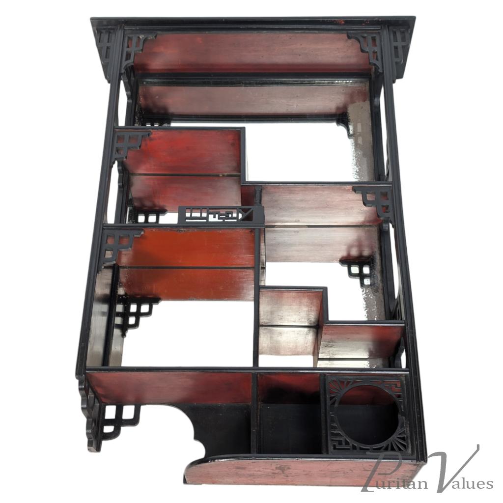 By Heals and Son, an oak wall shelf aligned to the Aesthetic Movement (1860–1890) in the Anglo-Japanese mode, c.1880. Designed with a stepped upper gallery supported by open sides and vertical divisions, above a lower tier with shaped brackets. The interplay of geometric fretwork, voids, and structure embodies the disciplined Anglo-Japanese aesthetic of late nineteenth-century London cabinet work.