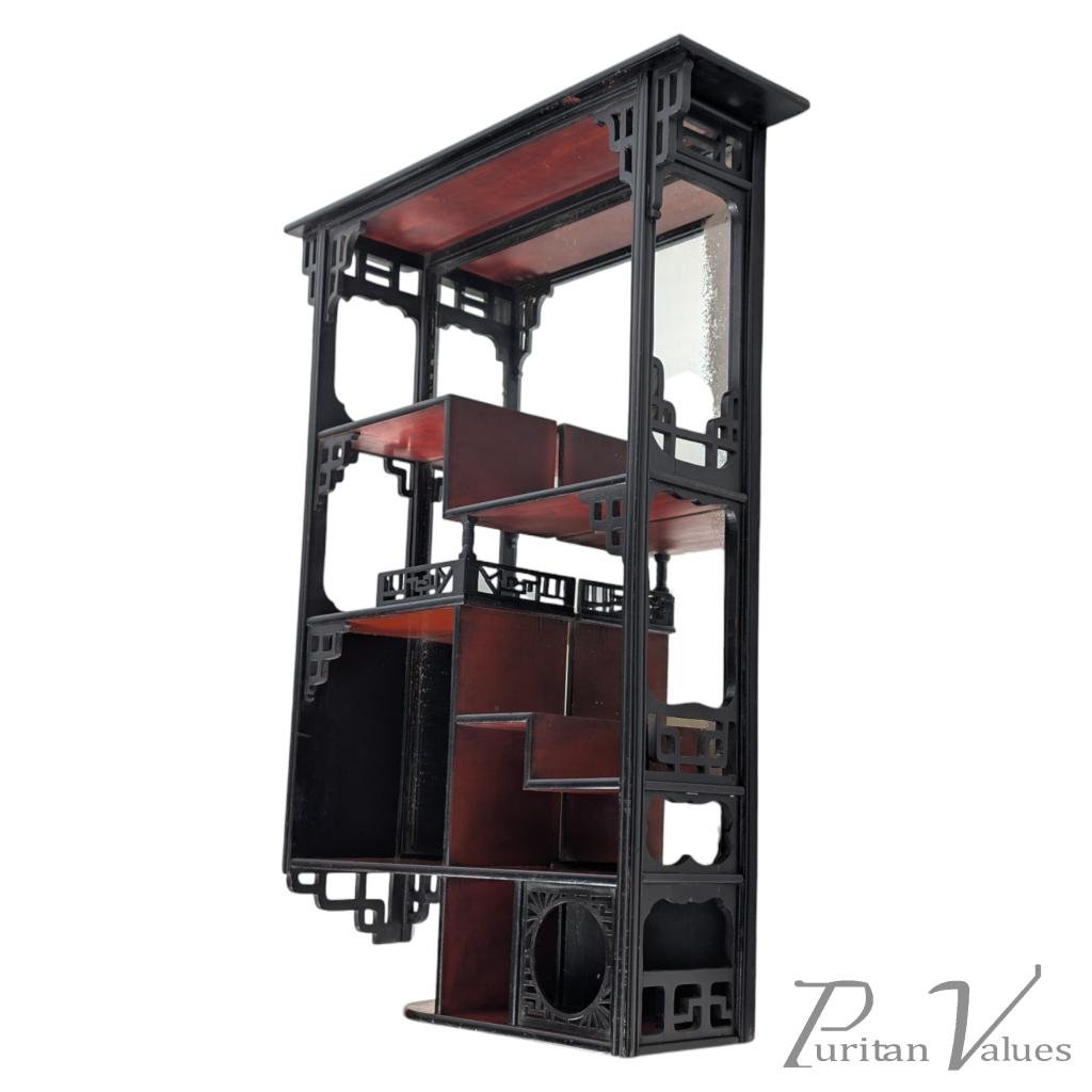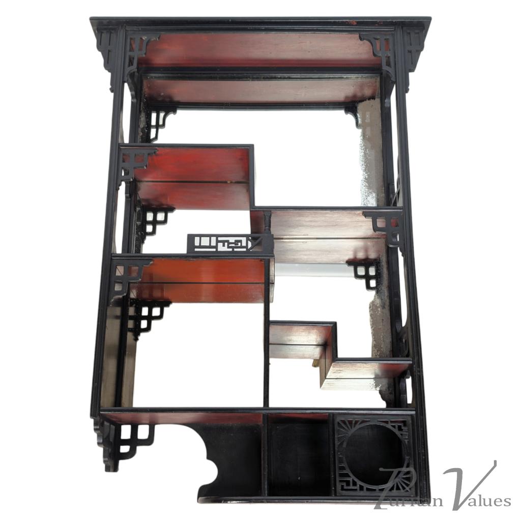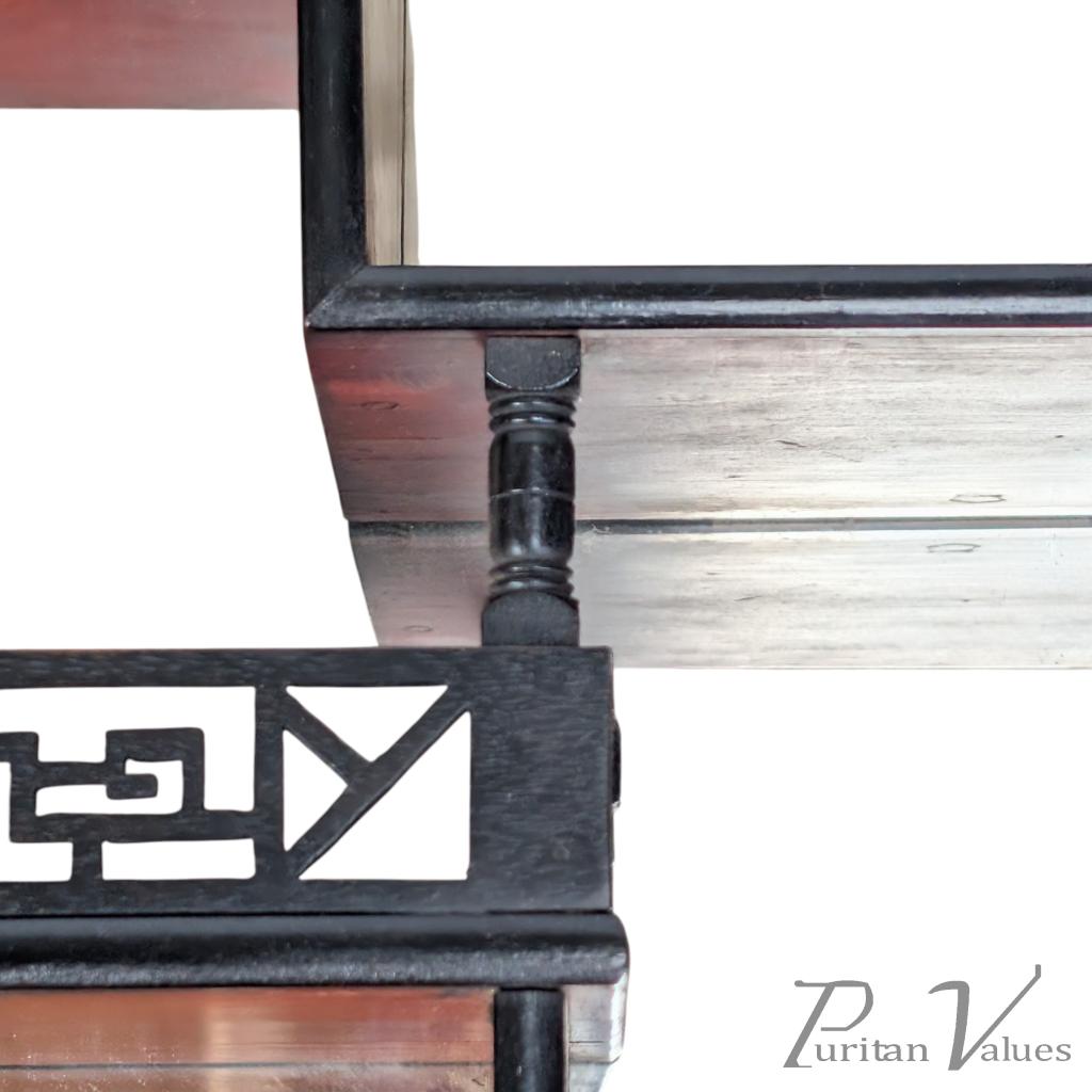By Heals and Son, an oak wall shelf aligned to the Aesthetic Movement (1860–1890) in the Anglo-Japanese mode, c.1880. Designed with a stepped upper gallery supported by open sides and vertical divisions, above a lower tier with shaped brackets. The interplay of geometric fretwork, voids, and structure embodies the disciplined Anglo-Japanese aesthetic of late nineteenth-century London cabinet work.