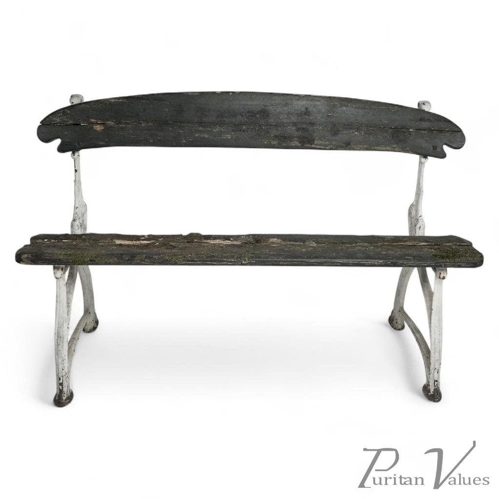Garden bench, a rare example retaining its original Art Nouveau wooden seat. It is important to note that the original wooden seat and back show complete purity in its original intended design. Cast iron coated in white. Examples with modern replacement seats and backs fade away from its conception and struggle to assert the ornate beauty within this design.