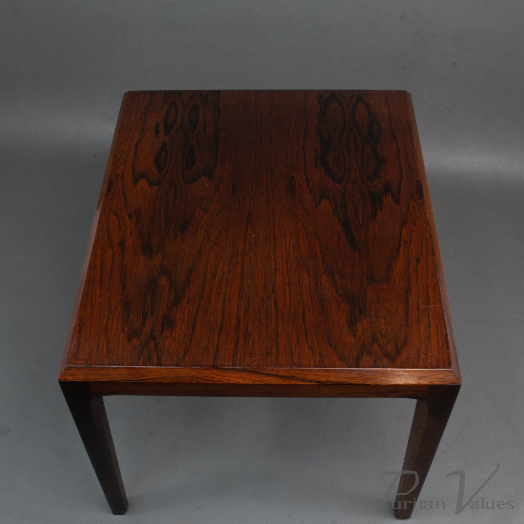 1960s Danish design rosewood occasional table with original C FC Silkeborg metal label to the underneath. Beautiful mirrored rosewood. Andersen became a certified cabinet maker in 1922.