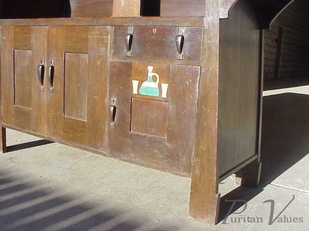 A fabulous Liberty and Co Arts and Crafts oak sideboard designed by Leonard Wyburd with an inlaid Boars head on a plate using inlays of walnut, Ebony, Pewter and Ivory, flanked by a pair of green bulls eye glass doors with three pewter flower buds beside and extended plinths below. A step down to a generous central serving area. A pair of large cupboards to the lower left hand side and a single drawer to the right with a further cupboard below, the door with a wine claret jug and glasses inlaid with pewter and a very early form of plastic, the only time I have seen early plastic inlaid into a piece of furniture was on a piece designed by C.R.Mackintosh. The metalwork with shaped pull style handles with heart shaped escutcheons. Height 68", Width 7', Depth 25".