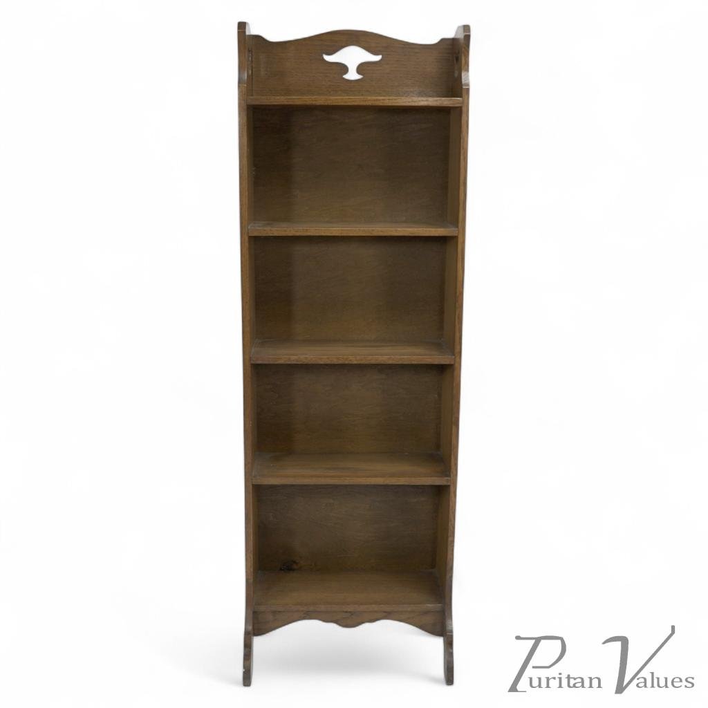 A slim Arts and Crafts oak bookcase with stylized floral cut-outs to the upper back and Tulip style cut-outs to the sides.