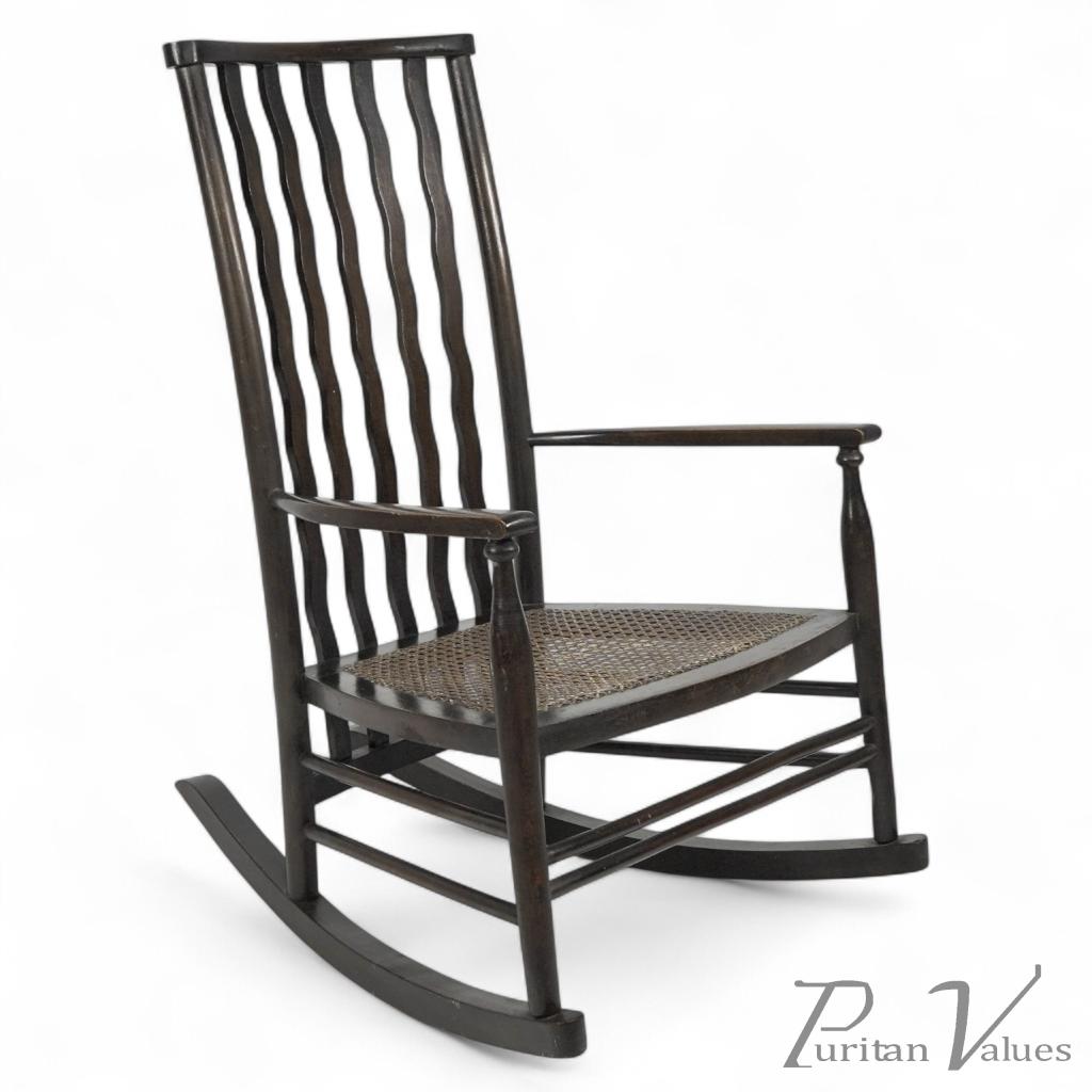 A sweet little beech stained and original cane seated rocking chair with a wonderful wavy back flowing down while attaching to the rear of the seat, then inserted into the lower back stretchers to strengthen it further.