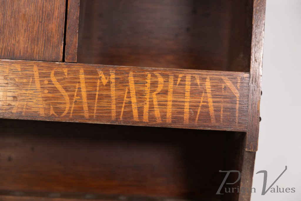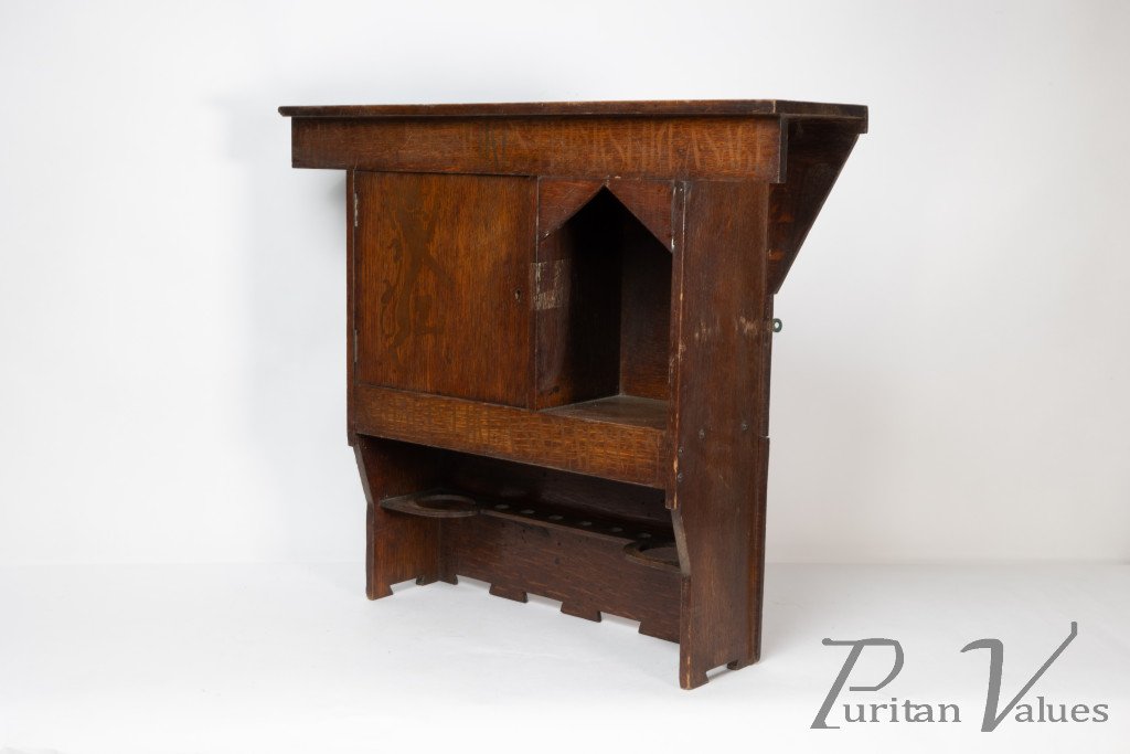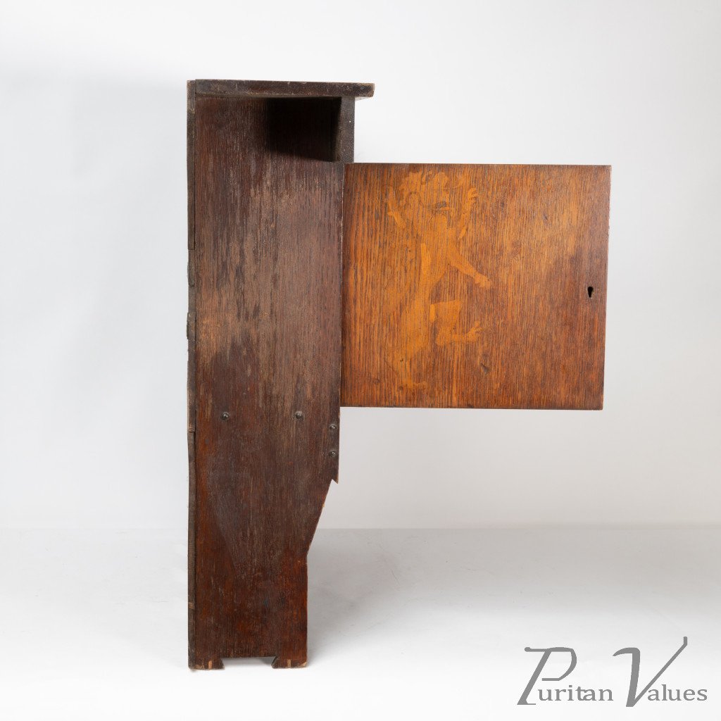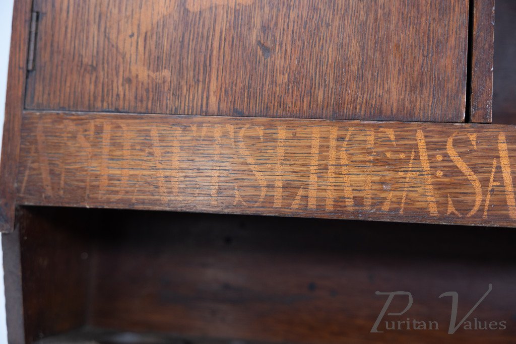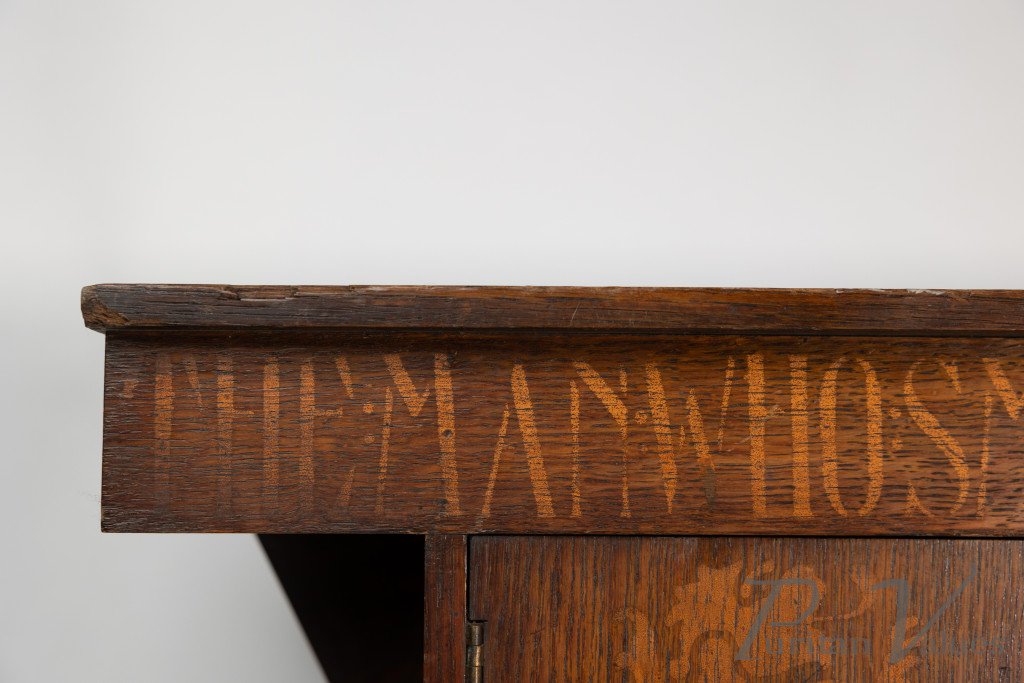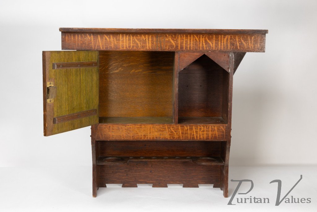 An Arts and Crafts wall cabinet with gold stencilled lion and a motto "THE MAN WHO SMOKES THINKS LIKE A SAGE AND ACTS LIKE A SAMARITAN," by Edward Bulwer-Lytton, 1st Baron Lytton.