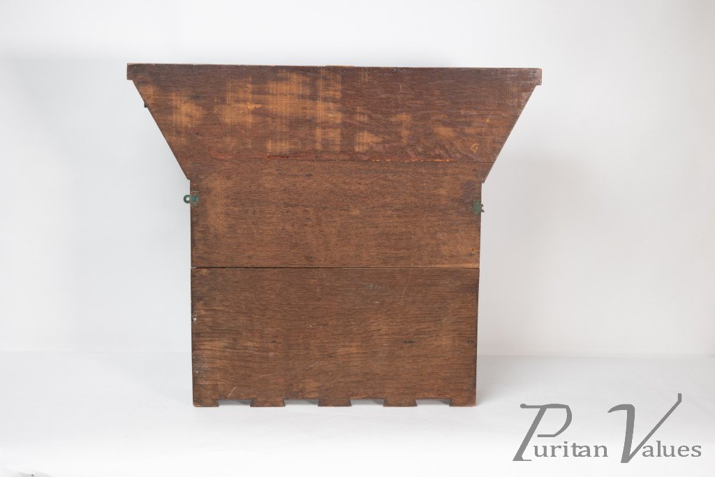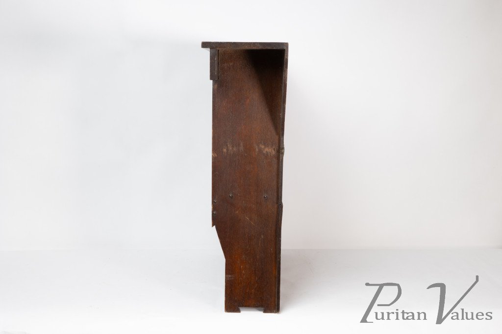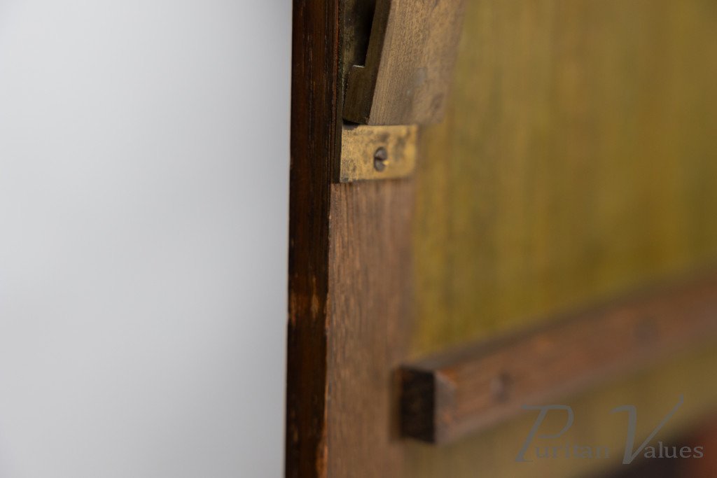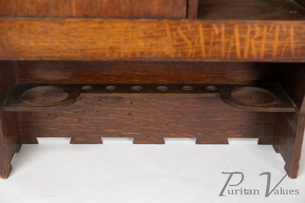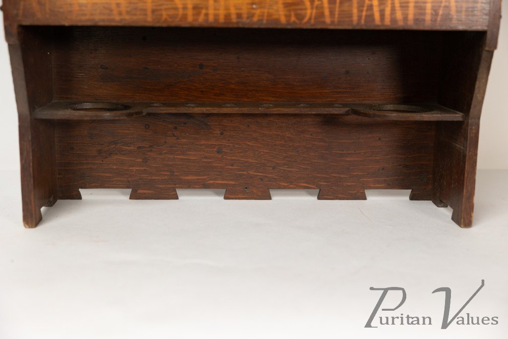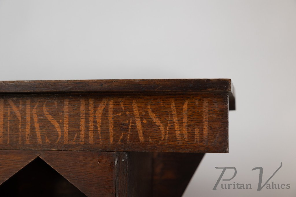 An Arts and Crafts wall cabinet with gold stencilled lion and a motto "THE MAN WHO SMOKES THINKS LIKE A SAGE AND ACTS LIKE A SAMARITAN," by Edward Bulwer-Lytton, 1st Baron Lytton.