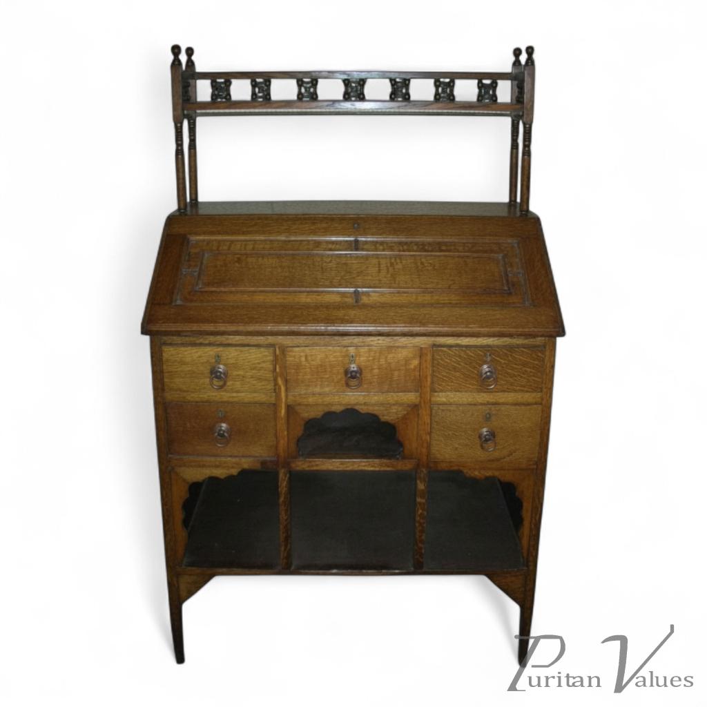 Liberty & Co., oak bureau in the Moorish style with Moucharabieh turnings to the top and retaining its original ink well.