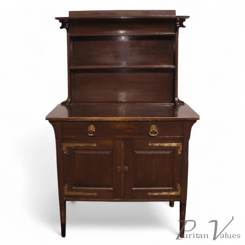 With plate rack to the upper section and two drawers with two cupboards below, superb quality stylised handles and hinges. The legs are a feature that Liberty & Co. have used on their Thebes stools. The colour also has a slight green tinge to it, which Liberty & Co. used quite widely on their furniture.