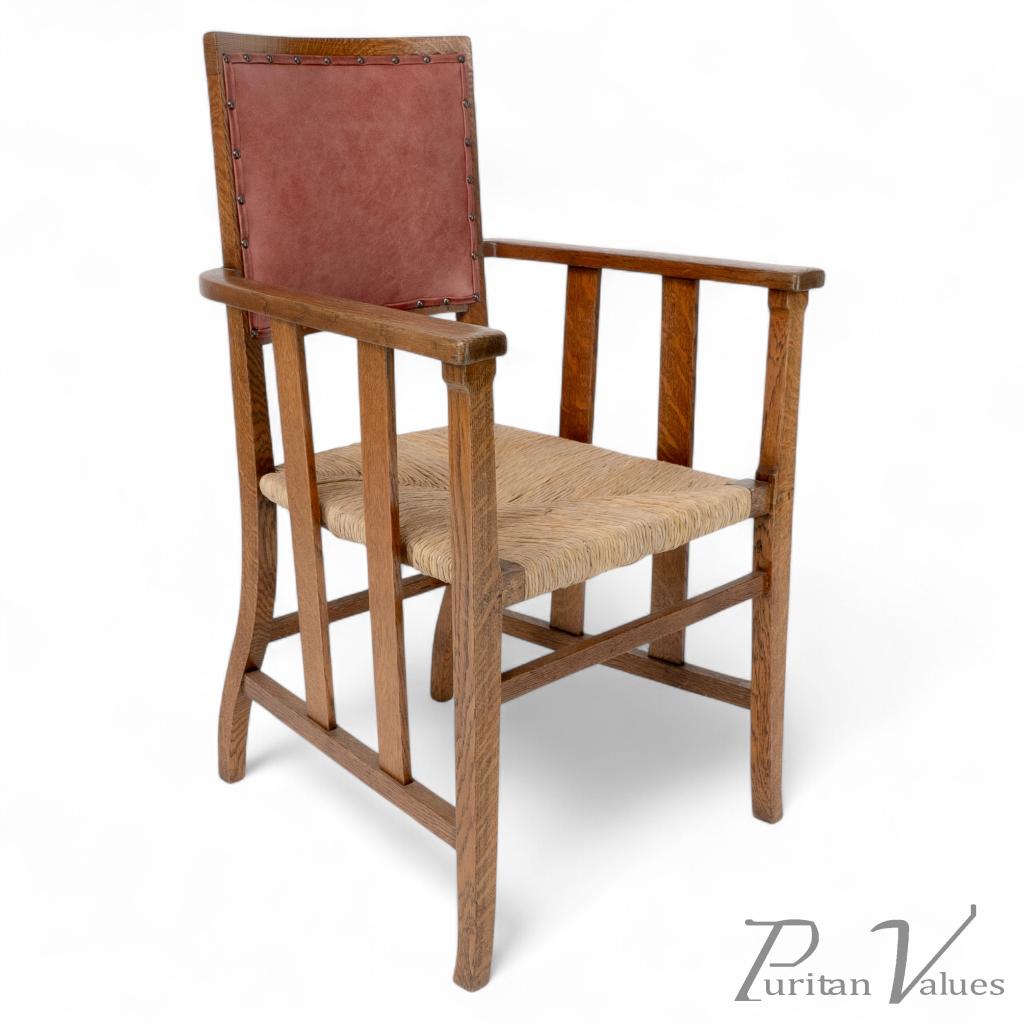 An Arts and Crafts rush seat armchair, with shaped back professionally reupholstered in a quality leather with slats running down from the arms past the seat to the side leg stretchers.