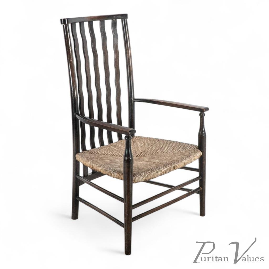 An Arts and Crafts rush seat armchair, with wavy shaped back slats running down past the seat to the back leg stretcher.