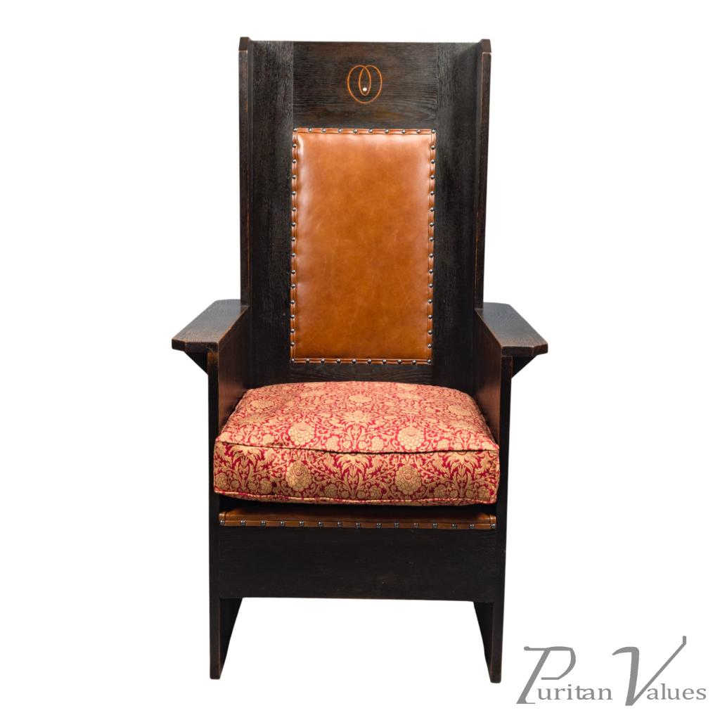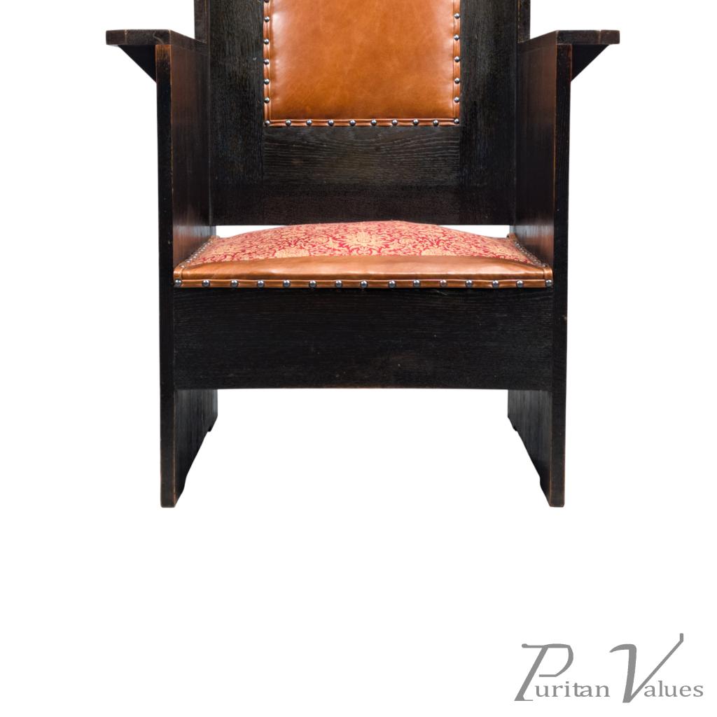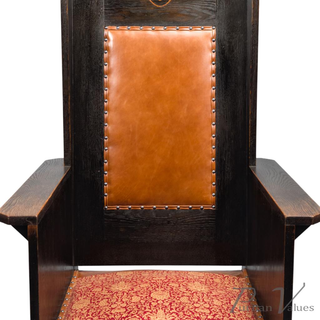 By Mackay Hugh Baillie Scott, an Arts and Crafts ebonised oak armchair, c.1903–1905. Architectural, high-back form with slab sides and broad, cantilevered arms. The back is centred by a nailed leather panel, with a stylised interlocking-oval motif above, inlaid and centred by a mother-of-pearl roundel. The seat is similarly upholstered with a nailed leather border framing a patterned textile panel.