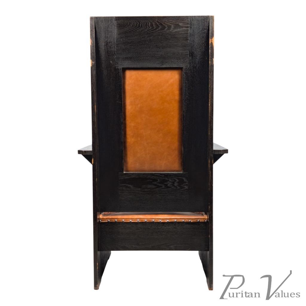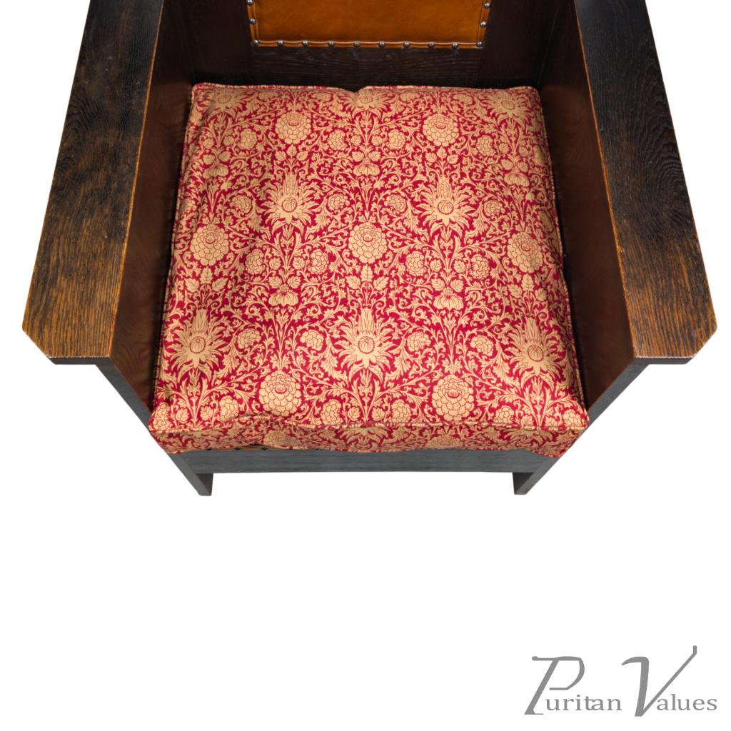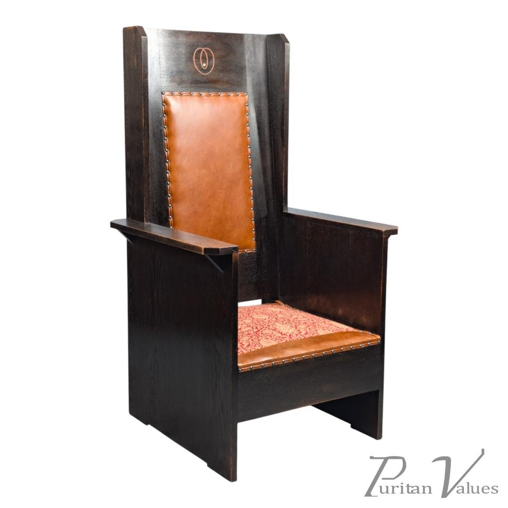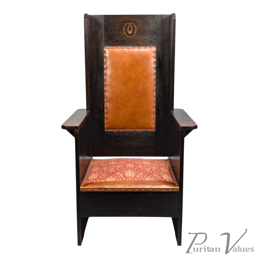 By Mackay Hugh Baillie Scott, an Arts and Crafts ebonised oak armchair, c.1903–1905. Architectural, high-back form with slab sides and broad, cantilevered arms. The back is centred by a nailed leather panel, with a stylised interlocking-oval motif above, inlaid and centred by a mother-of-pearl roundel. The seat is similarly upholstered with a nailed leather border framing a patterned textile panel.