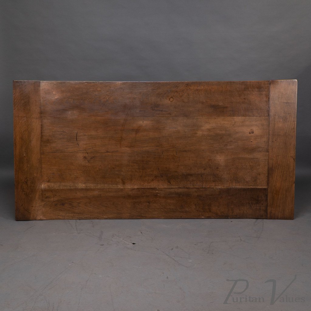 With finely shaped sledge style feet, united by a central floor stretcher with exposed through tenon joints to each end, and pegged throughout. Retaining the original finish with original wear in places where the top is slightly lighter.