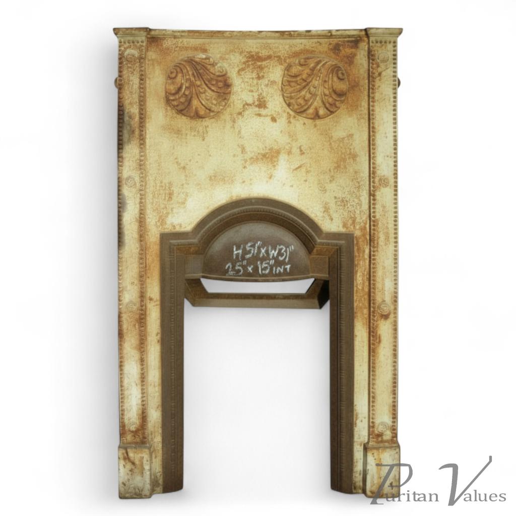This fireplace in cast iron sits within the Arts and Crafts (1880–1910) tradition, c.1900, British, in the manner of M. H. Baillie Scott. The composition is tall and narrow with a shallow arched opening set beneath a deep frieze. The upper panel carries two stylised spiral roundels, the edges worked with a fine bead, and the uprights rise as plain columns so the whole reads as a simple architectural frame rather than heavy ornament. The design is spare and graphic, relying on proportion, shallow relief and a disciplined outline that is consistent with Baillie Scott’s preference for quiet surface and strong geometry in domestic metalwork.