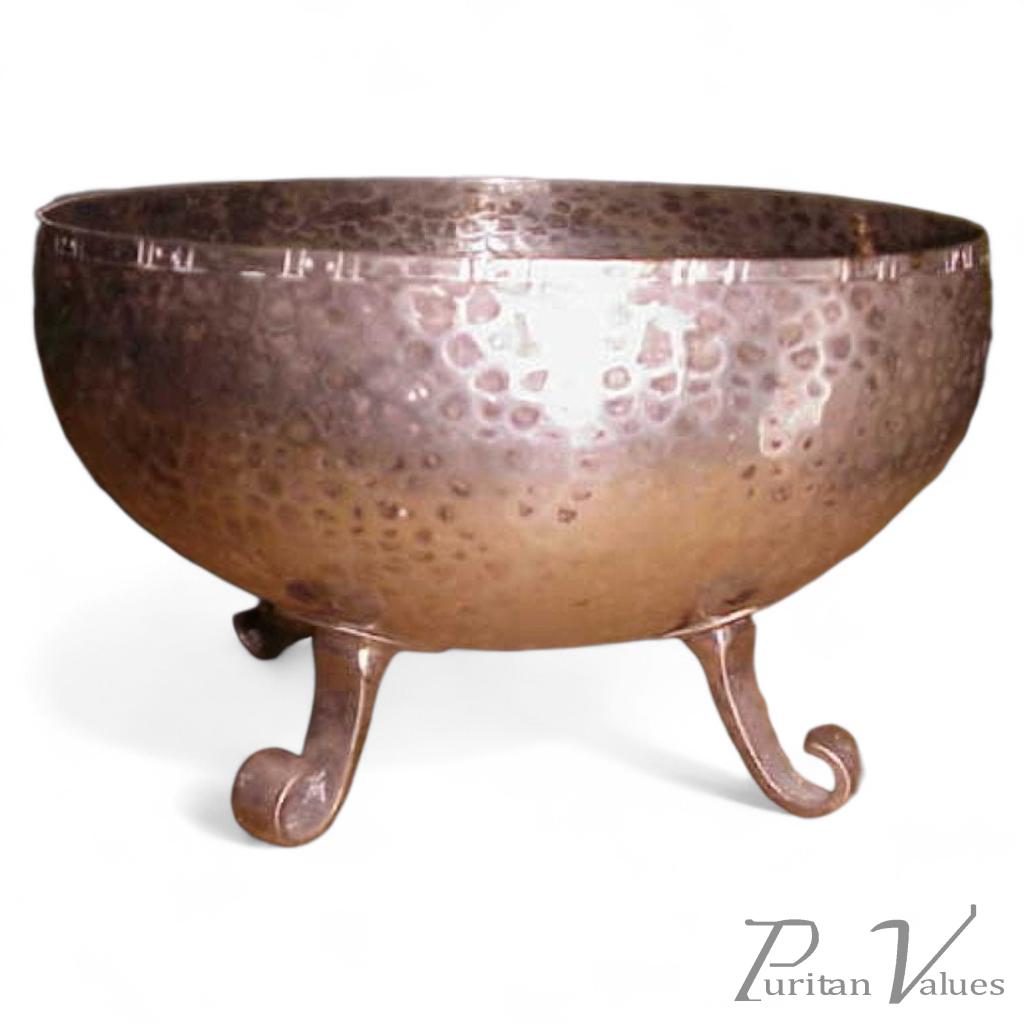The bowl is of hammered and raised construction, circular in plan with a slightly everted rim and three scroll-ended legs hand-forged and silver-plated over copper.