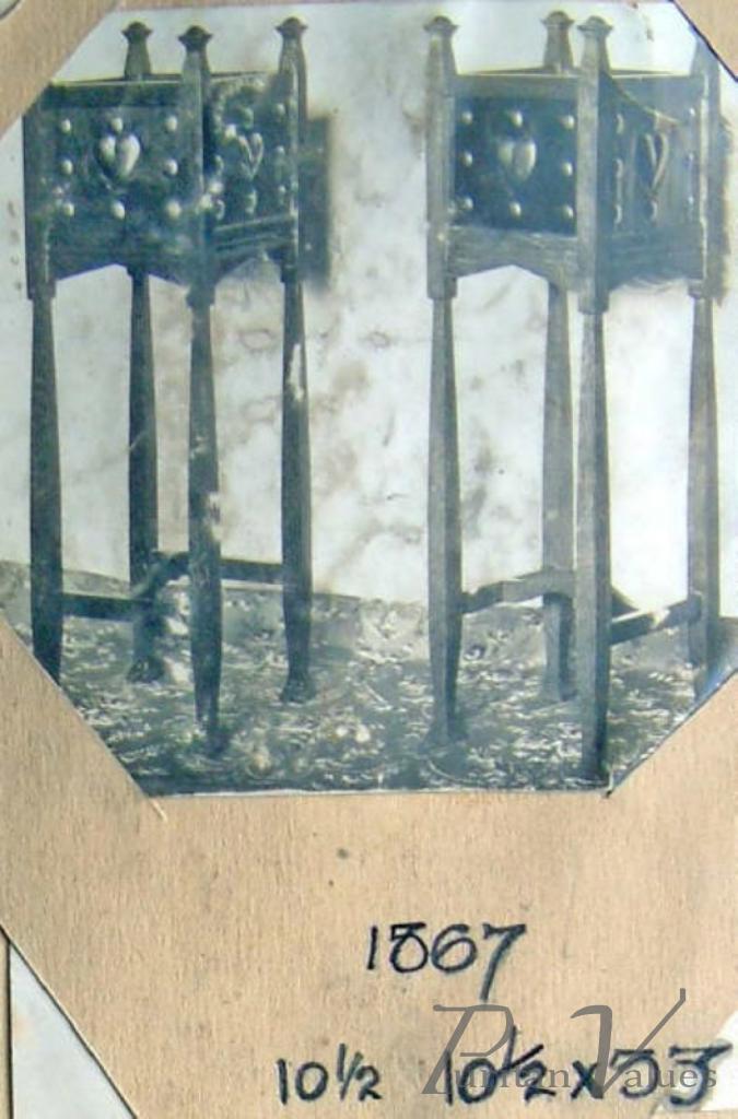 A closely related design titled Plant Holders 1867 is held in the Barnstaple and North Devon Museum’s eHive collection (object no. 3574). The archival photograph shows an identical arrangement of repoussé copper heart panels within a similar oak surround