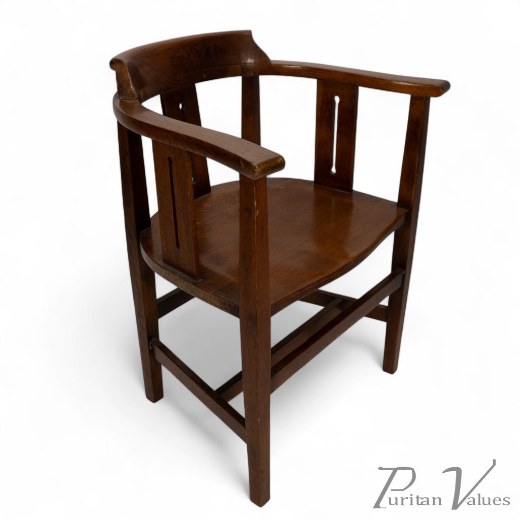 A good set of seven Arts & Crafts oak armchairs with shaped headrests, stylized cutouts to the side and back splats, and contoured comfortable seats with a good stretcher arrangement making them very strong and sturdy.