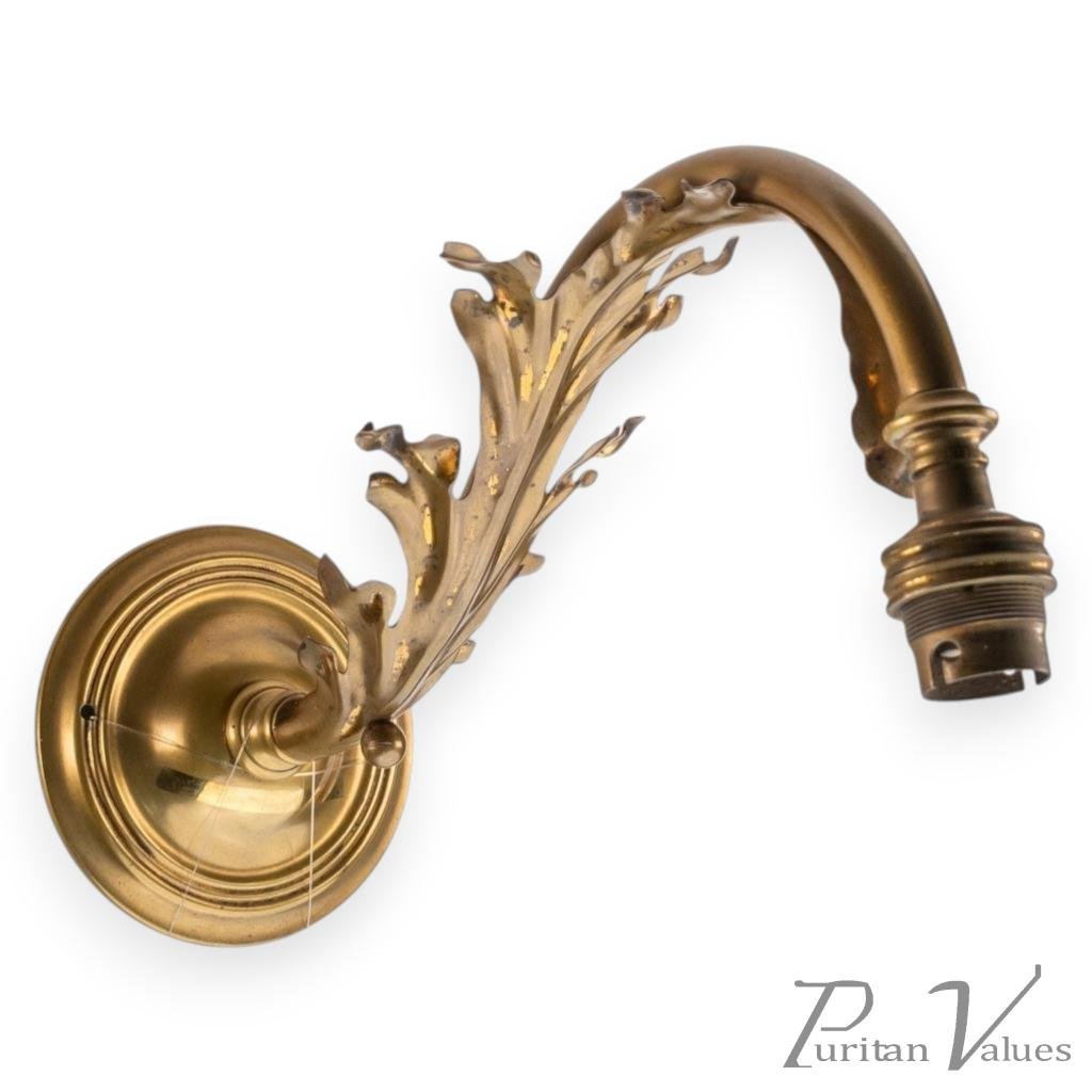 Single brass wall light, aligned to the Arts and Crafts movement (1880–1910), c.1905. Curved arm rises from a round, stepped backplate with a stylised leaf mount, the brass now polished. Compact proportions and a generous projection make it ideal beside a mirror or as a reading light.