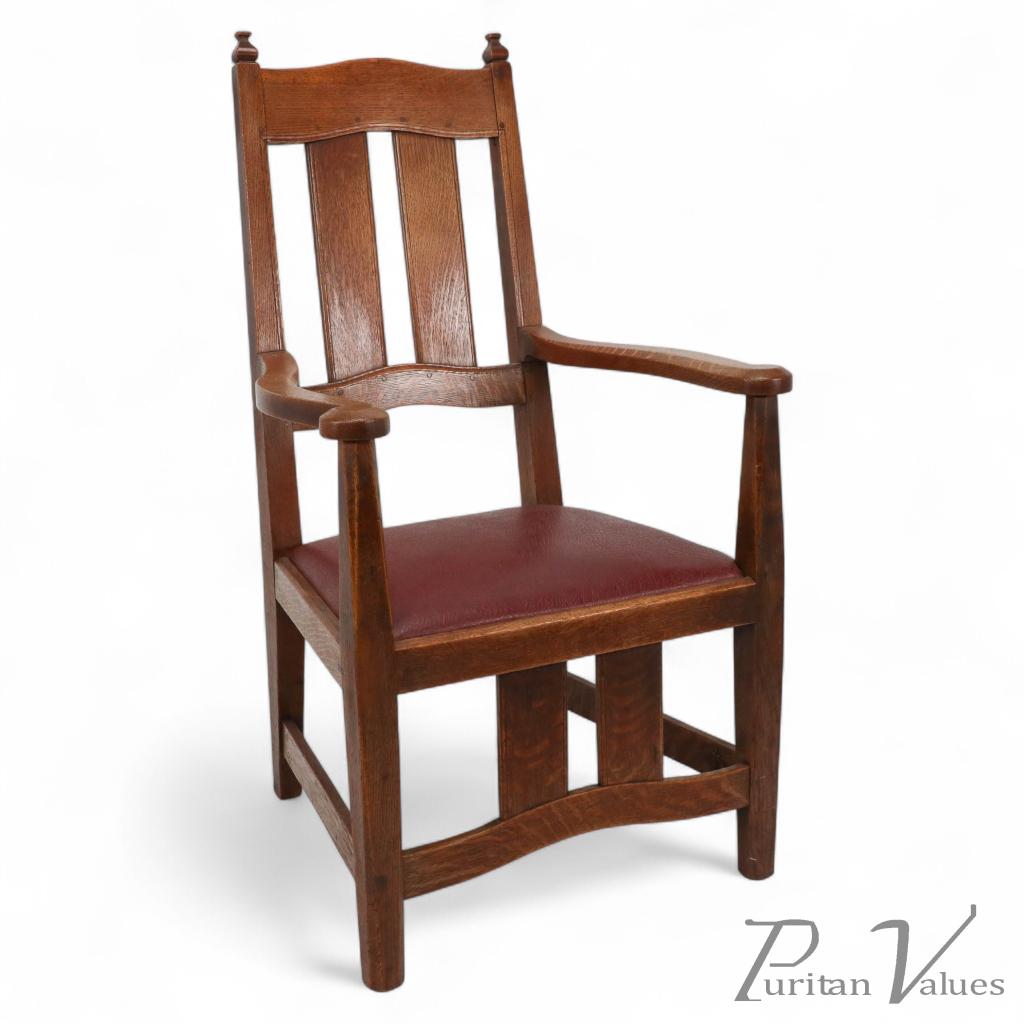 A rare Arts & Crafts sculptured oak armchair with shaped arms, shaped head rest, and lower stretchers united by large plank uprights. Lethaby was one of the most influential architectural historians of the nineteenth century. Working as assistant to R. Norman Shaw from 1879-90, his designs and influence were drawn greatly from the Art Workers' Guild. He published books including Architecture, Mysticism and Myth, and later in 1894, The Church of Sancta Sophia, Constantinople: a study of Byzantine Building.