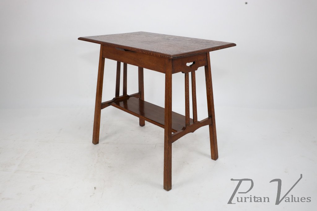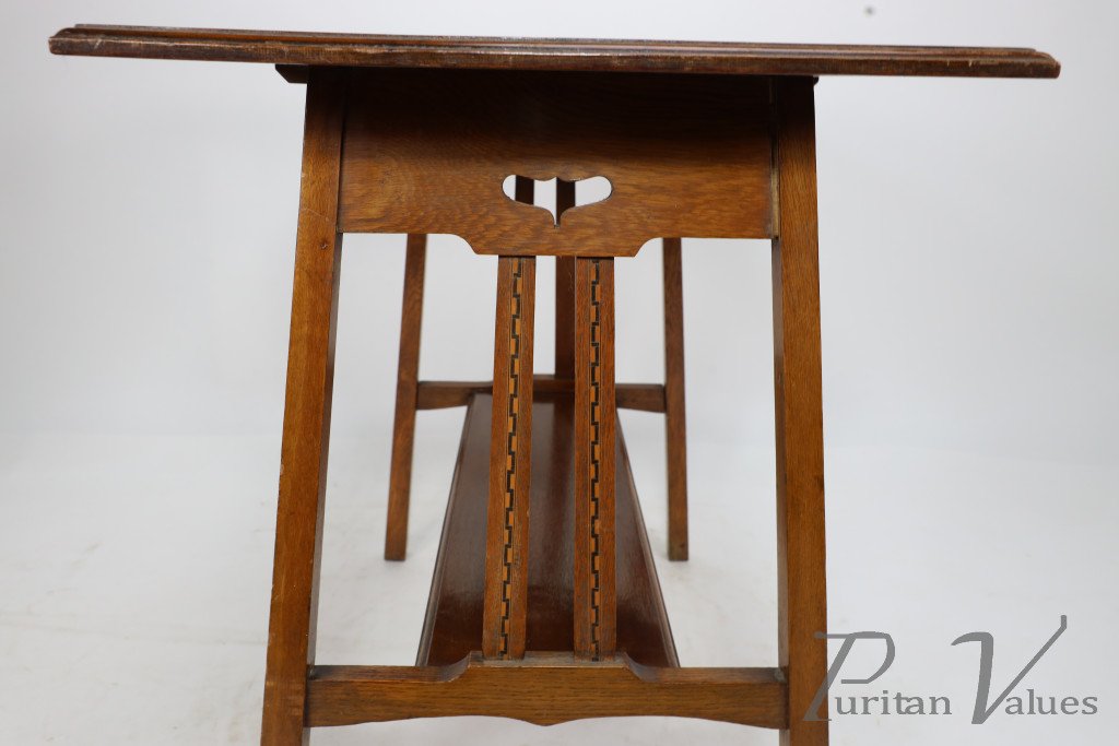An Arts and Crafts side table with oblong chequered inlaid top and curved aprons below stood on slender tapering legs united by stretchers and a conforming lower shelf.