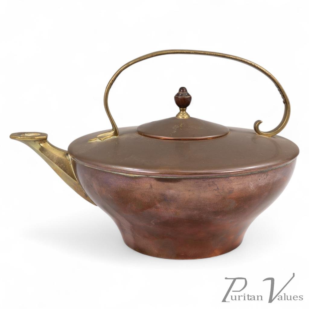 By W. A. S. Benson, a copper and brass kettle aligned to the Arts and Crafts movement (1880–1910), c.1900. The broad-bellied body rises to a low domed lid with a small turned finial; a tall arched brass handle springs from simple sockets, balanced by a slender projecting spout. The spare, utility-led silhouette and mixed metals reflect Benson’s workshop vocabulary of honest construction and refined everyday forms.