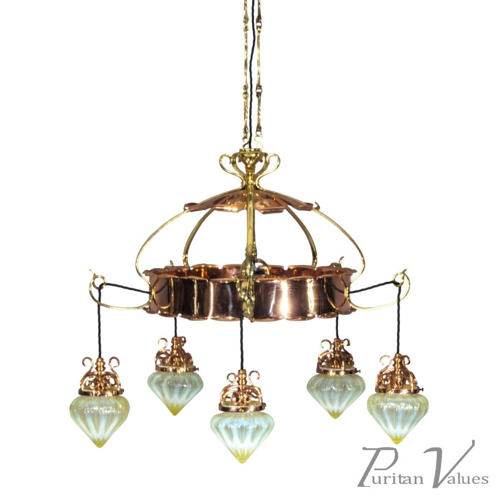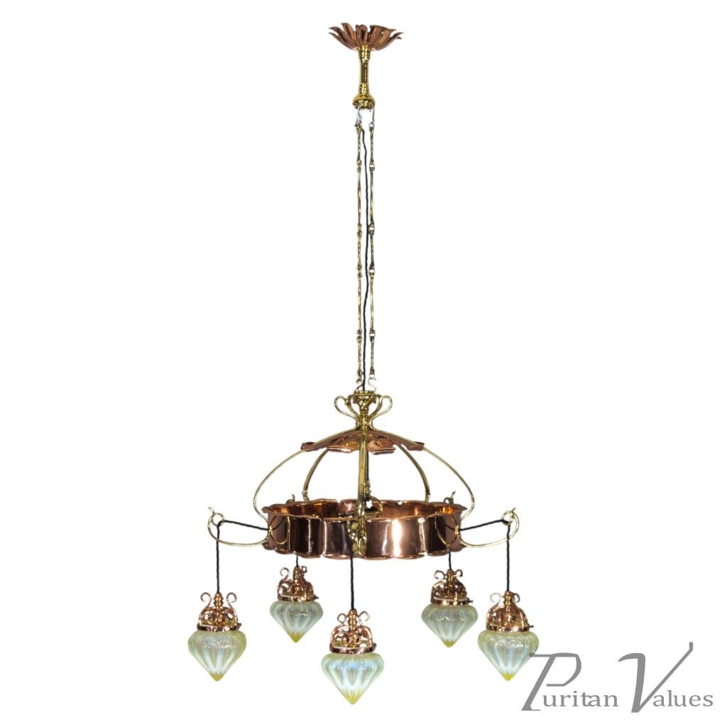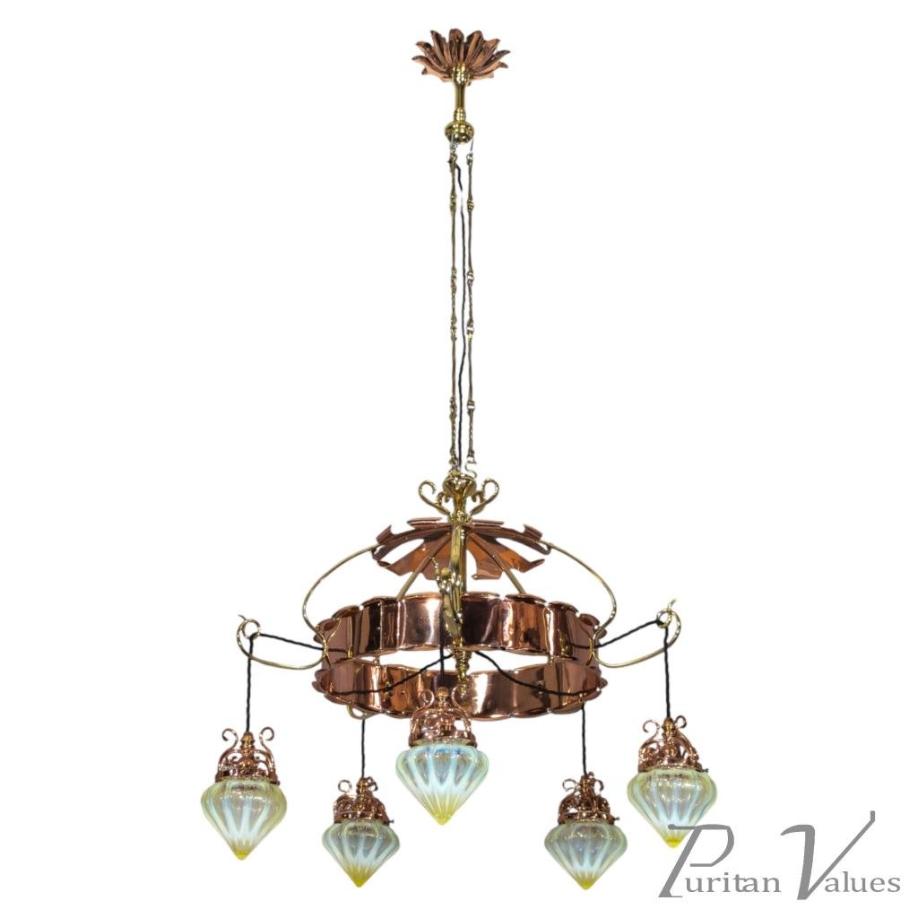 W. A. S. Benson. An Arts & Crafts Copper & Brass Chandelier with 5 Vaseline Shades