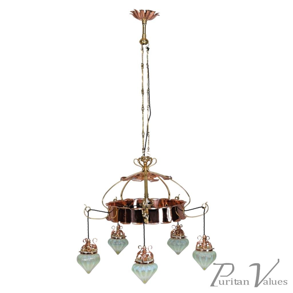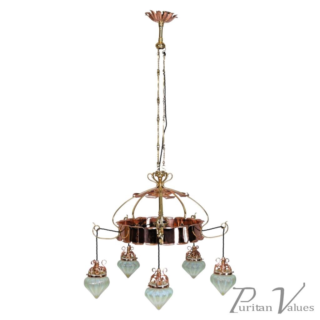 A rare Arts & Crafts copper & brass five-branch chandelier with the original ceiling plate to the top and a turned support below, connecting to five whiplash arms with an upper decorative copper plate with scrolled edges.