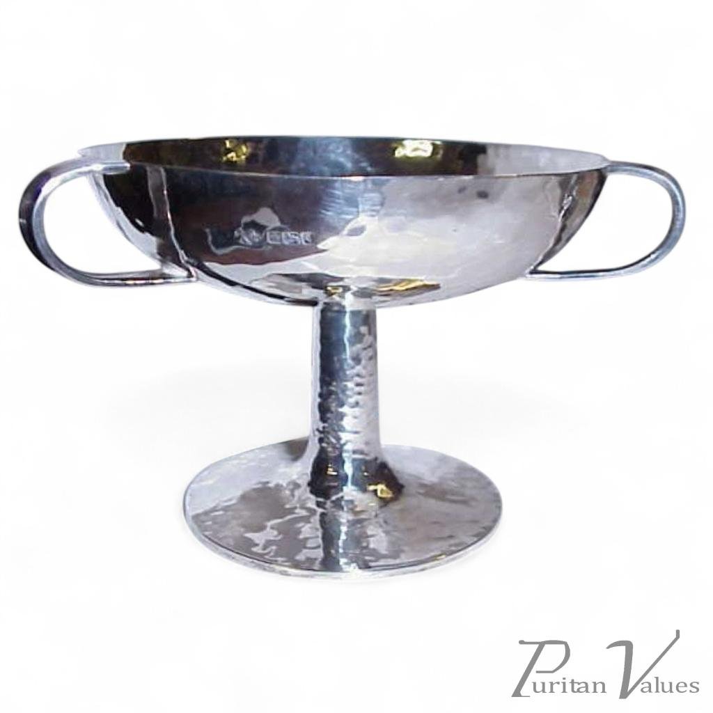 By William Hutton, a bon bon dish in silver aligned to the Arts and Crafts movement (1880–1910), c.1908, from a British silversmithing workshop. The shallow bowl shows a hammered surface with even planishing, rising on a stem and circular foot with three opposing loop handles for lifting. The compact scale suits dining table or sideboard service, and the clear, tool-worked surface is typical of Arts and Crafts metalwork.