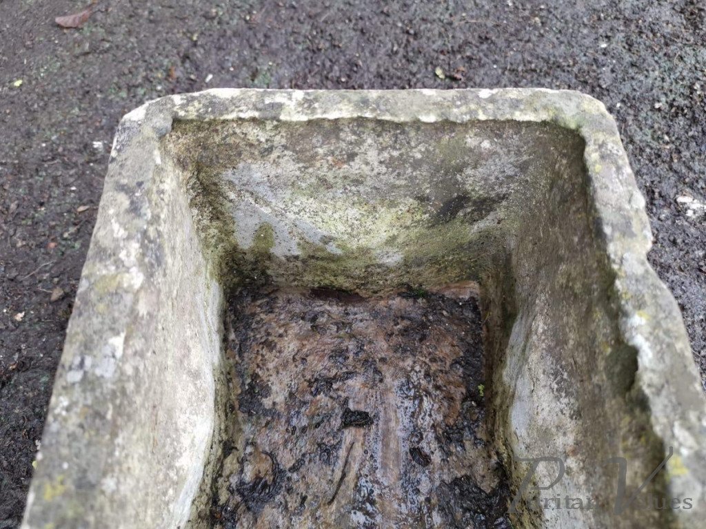 A Mid-Century Modern concrete rectangular garden planter with rectangular concave decoration with opposing triangular shapes to the centres.